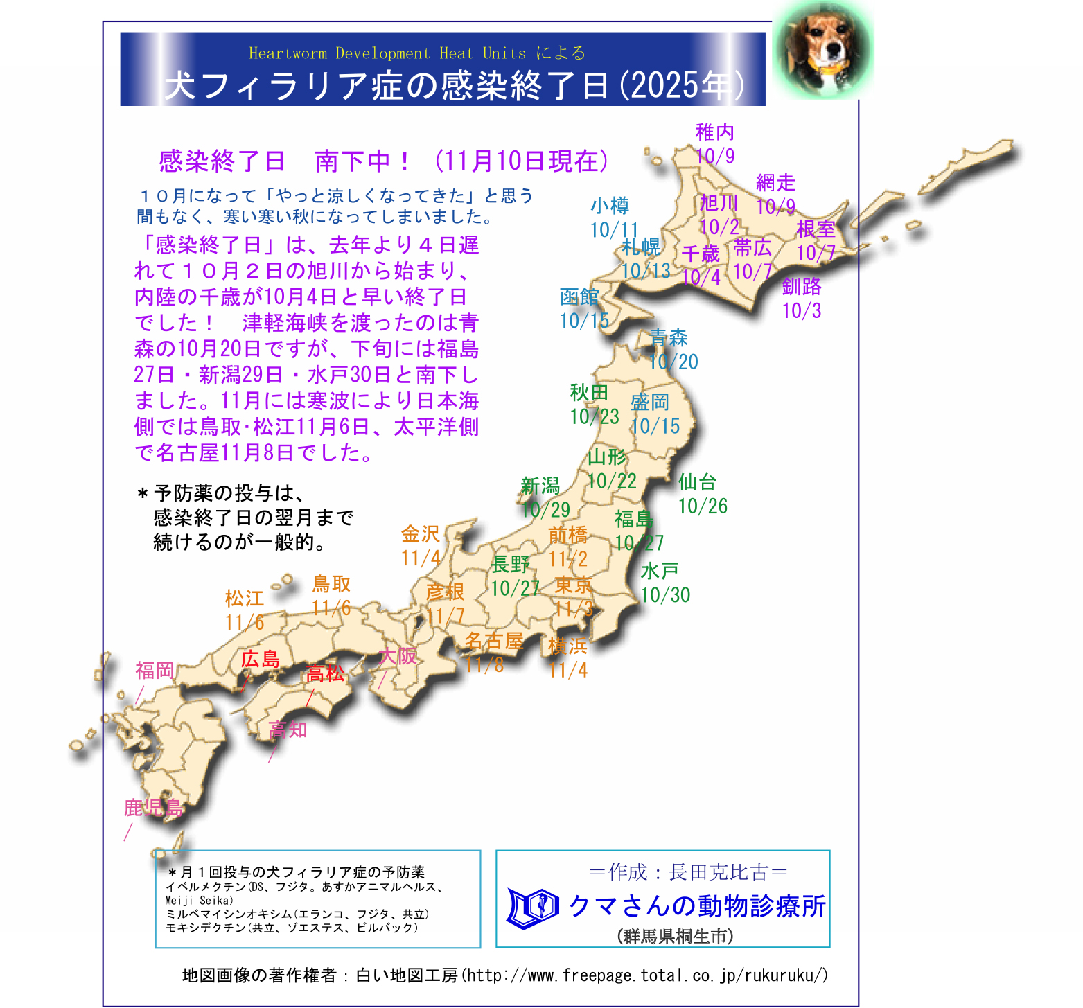 [11月10日現在] 2025年の「犬のフィラリア症の感染終了日」予想を、掲載しました。感染終了日は。去年より4日遅れて10月 2日の旭川(北海道)から始まり、11月には寒波により日本海側では鳥取・松江11月6日、太平洋側で名古屋11月8日でした。