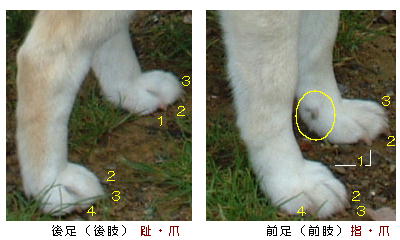 えっと・・・ パールちゃんのレスに横レスになりますが、 狼爪の定義ですが、2通りあるようです。 1.前肢と後肢の地面と接していない指や爪。 2.後肢にある地面と接していない指や爪。 ご参考までに、画像を添付 前肢で狼爪と呼ばれるのは、人で言う親指(画像のマルで囲んだもの)です。 1.2.3.4は、人の指に例えると人差し指(1番)から小指(4番)までになります。 画像の後肢には、生まれつきありません。 日本犬保存会や警察犬協会などの犬種定義では、前肢を含めて狼爪と呼んでいます。 猟犬の場合は、怪我の防止の為に切除されることもありますし、 犬種のスタンダードでは、ショーでの規定で前・後肢も切除が好まれる場合や そのままでも構わない場合などあります。 家庭犬の場合は残しても問題は無いと思いますが、爪切りなどのケアは必要です。 後肢のことを狼爪と呼ぶのは、多くの場合、 犬の前肢には指5本(退化途中の親指あり)、後肢には指4本(親指は退化してなし)が多い為であると考えます。 ただ、大型犬では狼爪が2本以上生えている子もいます。 地面に接する指が多い子もいます、指が多い場合は多指症と言います。 6本指の犬種ルンデフンド(Lundehund/Norwegian Puffin Dog)がいます。 ルンデフンドの場合は、退化した指ではなく作業犬として進化して多くなった指なのです。 当然肉球も他の犬種とは違って、足指の働きは人に近いと言われているようです。 余談ですが、文豪ヘミングウェイの可愛がった猫たちも多指症で、器用な子が多いとか。 |
