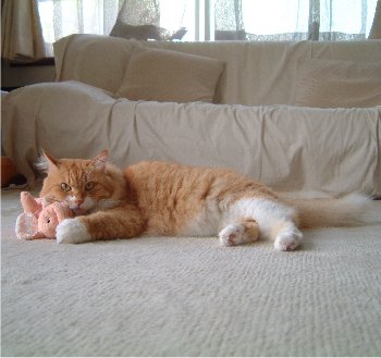 すっかりデジカメにもペイントショップにも慣れたつもりだったのに、あんなミニ画像に なってしまって・・・・もう一度やり直しました。お手数ですが、画像を消せるようでしたら よろしくお願いいたします。 普段ぬいぐるみ系には全く無関心なうちの子ですが、またたびをつけたら暫し 気に入って抱っこして、ケリを入れてました・・・(はじめて見たのでなんか猫らしくて 嬉しかったです。) みゃーちゃん「この子もう匂いがしなくてあきちゃったー。やっぱりママの手作りの 軍手で作ったねずみもどきの方がおもしろいー。象さんは結構弱いのね・・・あたしの ケリでまいっちゃってるの・・・」